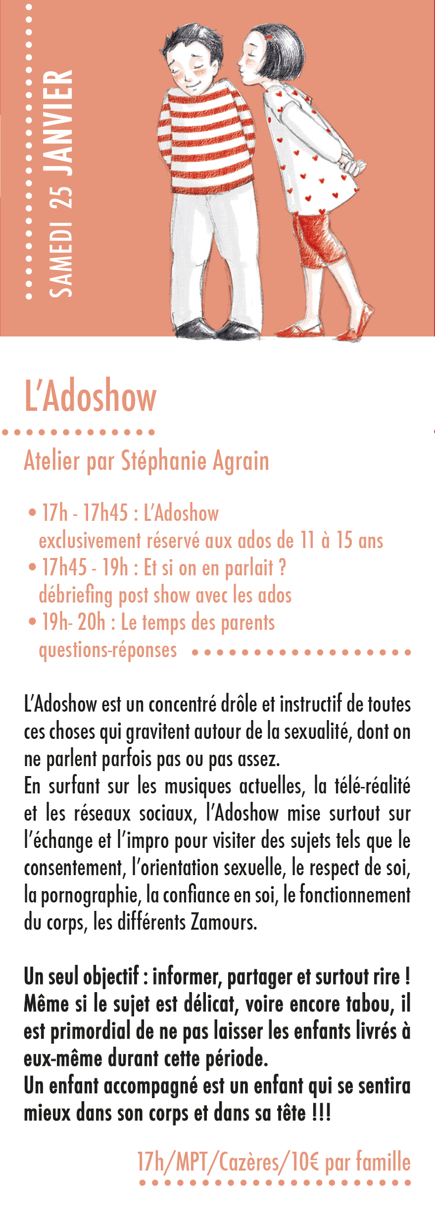L’Adoshow est un concentré drôle et instructif de toutes ces choses qui gravitent autour de la sexualité, dont on ne parlent parfois pas ou pas assez.